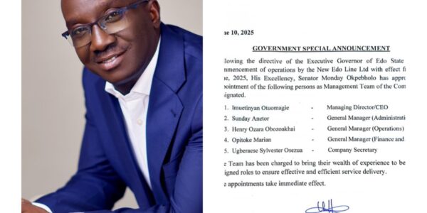 Benin City – The Edo State Government has officially announced the commencement of operations for the New Edo Line Ltd, effective from June 27, 2025. This follows a directive by the Executive Governor of the state, Senator Monday Okpebholo. In…