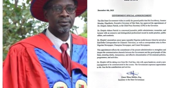 Benin City — The Edo State Government has officially announced the appointment of Dr. Ebojele Akhere Patrick as the new Chief Press Secretary (CPS) to the Governor. The approval was granted by His Excellency, Senator Monday Okpebholo, Executive Governor of…
