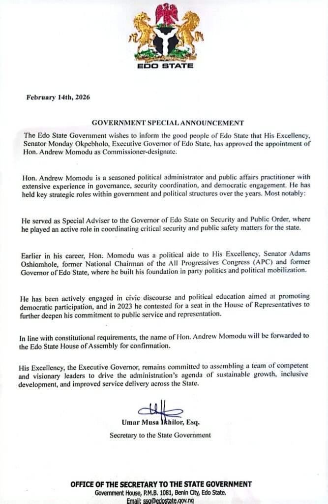 The Edo State Government has announced the appointment of Hon. Andrew Momodu as Commissioner-designate, following approval by Governor Monday Okpebholo.