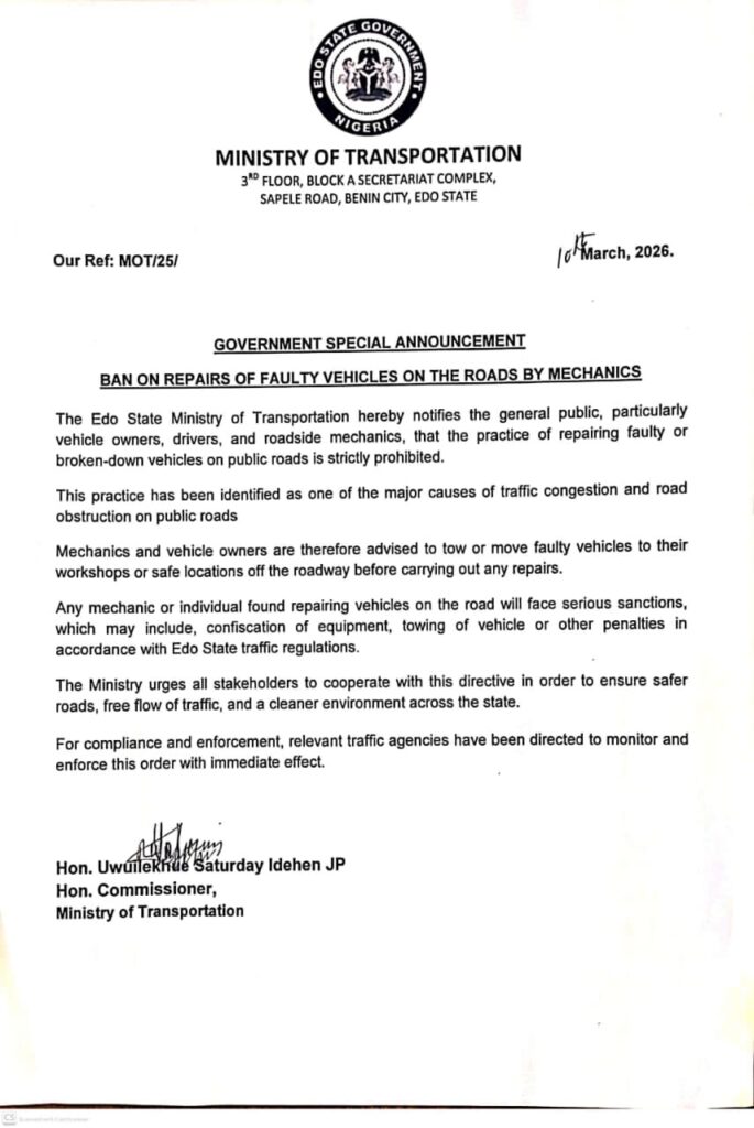 In a special government announcement issued in Benin City on March 10, the ministry warned mechanics, vehicle owners, and drivers against carrying out repairs on highways and major streets.