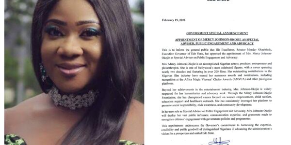 Benin City- The Governor of Edo State, Monday Okpebholo, has approved the appointment of Mrs. Mercy Johnson-Okojie as Special Adviser on Public Engagement and Advocacy. The appointment, announced by the Secretary to the State Government, Umar Musa Ikhilor, Esq., is…